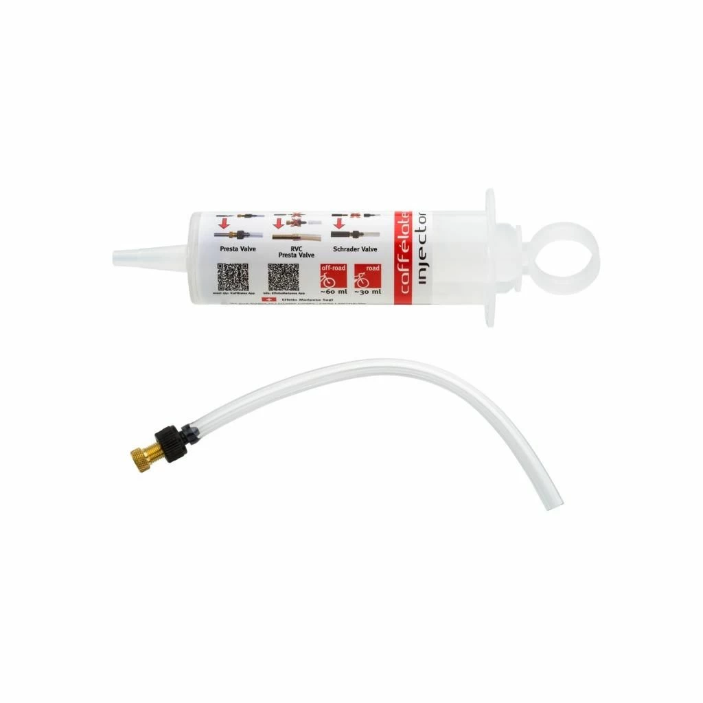 Caffélatex Injector ermöglicht das kontrollierte, schnelle und saubere Einspritzen des Dichtmittels durch das Ventil. Es funktioniert sowohl mit Presta-Ventilen (mit oder ohne Entfernen des Ventilmechanismus) als auch mit Schrader-Ventilen und wird mit einem langen Kunststoffschlauch geliefert, dies erleichtert das schnelle und saubere befüllen.